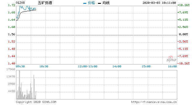 新浪港股讯,五矿资源(01208)升10.26%,报1.72元,最高价为1.72元,最低价为1.61元,主动买盘58%;成交766.8万股,涉资1281.46万元。