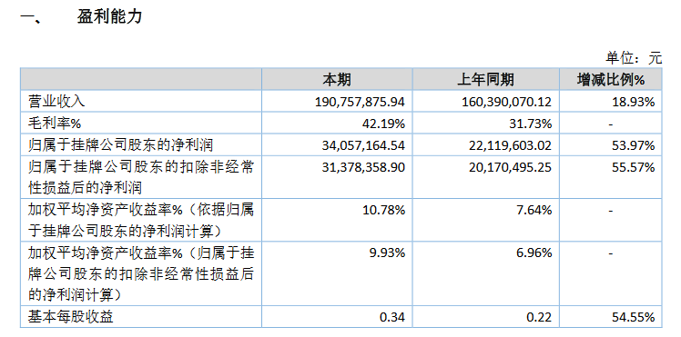 业绩方面,公司符合精选层财务标准一。去年,公司实现营业收入1.91亿元,归母利润为3406万元,加权平均净资产收益率为10.78%。