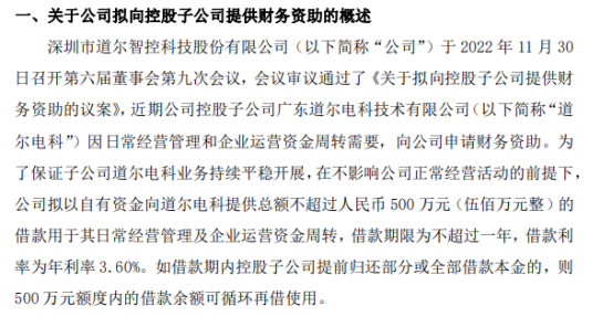 挖贝网11月30日,道尔智控(832966)近日发布公告,深圳市道尔智控科技股份有限公司(以下简称“公司”)于2022年11月30日召开第六届董事会第九次会议,会议审议通过了《关于拟向控股子公司提供财务资助的议案》,近期公司控股子公司广东道尔电科技术有限公司(以下简称“道尔电科”)因日常经营管理和企业运营资金周转需要,向公司申请财务资助。为了保证子公司道尔电科业务持续平稳开展,在不影响公司正常经营活动的前提下,公司拟以自有资金向道尔电科提供总额不超过人民币500万元(伍佰万元整)的借款用于其日常经营管理及企业运营资金周转,借款期限为不超过一年,借款利率为年利率3.60%。如借款期内控股子公司提前归还部分或全部借款本金的,则500万元额度内的借款余额可循环再借使用。