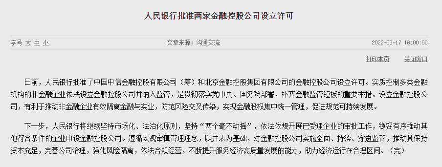 今年3月,央行设立许可并正式成立的两家金融控股公司分别是中国中信金融控股有限公司和北京金融控股集团有限公司。其中,中国中信金融控股有限公司于2022年3月24日正式成立。