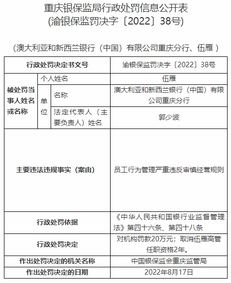 中国经济网北京8月29日讯 中国银保监会网站近日公布的重庆银保监局行政处罚信息公开表(渝银保监罚决字〔2022〕38号)显示,澳大利亚和新西兰银行(中国)有限公司重庆分行存在员工行为管理严重违反审慎经营规则的违法违规事实。依据《中华人民共和国银行业监督管理法》第四十六条、第四十八条,中国银保监会重庆监管局对机构罚款20万元;取消伍雁高管任职资格2年。