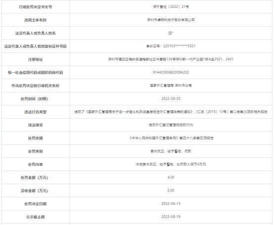 中国经济网北京8月22日讯 国家外汇管理局网站近日披露的深外管检〔2022〕21号显示,深圳市德明利技术股份有限公司(证券简称:德明利,001309.SZ)存在违反外汇登记管理规定的行为。