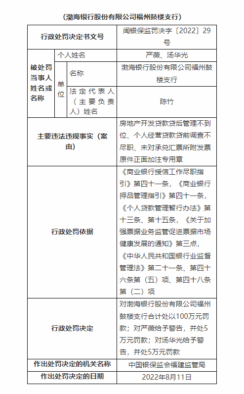 8月17日,中国银保监会官网更新的处罚公告显示,因房地产开发贷款贷后管理不到位等案由,渤海银行福州鼓楼支行被罚款100万元。