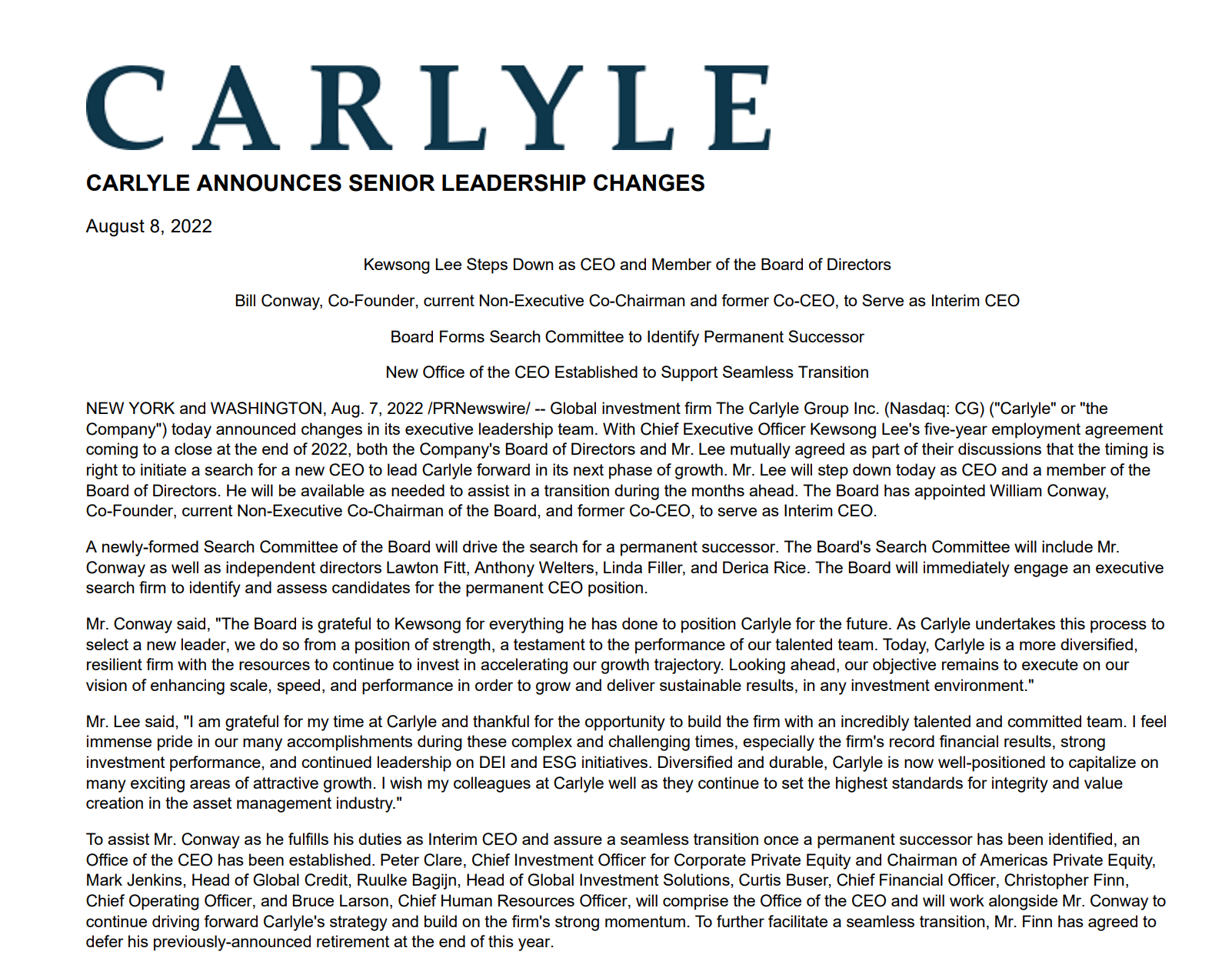 李揆晟的合同原本将在年底到期,在两周前凯雷公布财报时并没有提及管理层可能出现变化。最新的人事变化也迫使公司首席运营官Chris Finn推迟既定的退休计划,加入新成立的“CEO办公室”协助权力过渡。