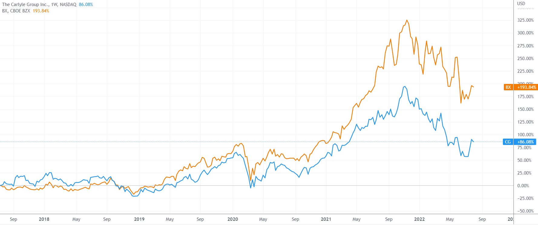 (凯雷、黑石过去五年股价走势对比,来源:TradingView)