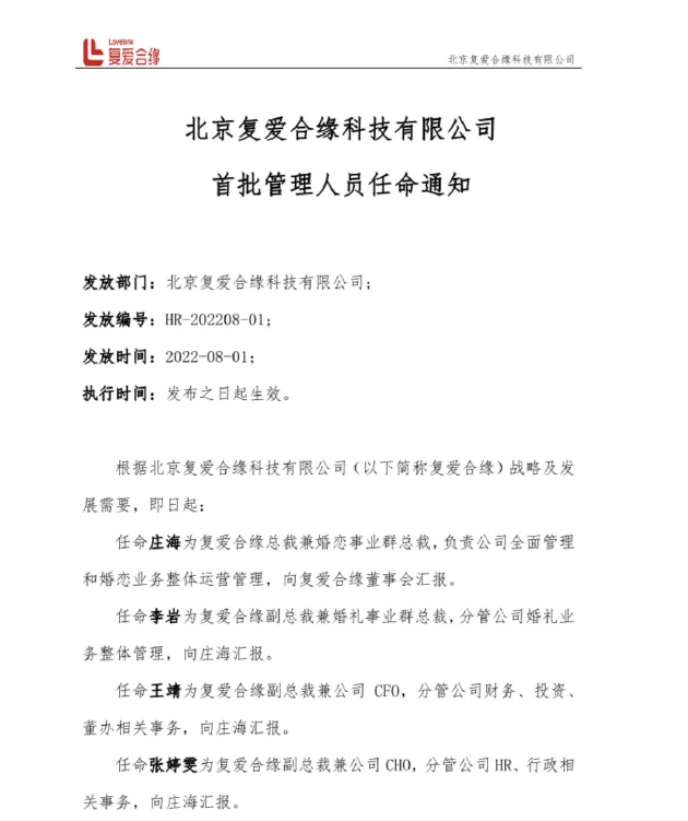 其中,庄海为复爱合缘总裁兼婚恋事业群总裁,负责公司全面管理和婚恋业务整体运营管理,向复爱合缘董事会汇报。