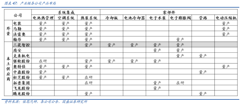 国盛证券丁逸朦在7月10日发布的研报中表示,细分开看,三花智控在热管理领域布局的产品有热泵系统、冷却板、电池冷却板、电子水泵、电子膨胀阀;银轮股份在研电池热管理,布局热泵系统、冷却板、电池冷却板、电子水泵。