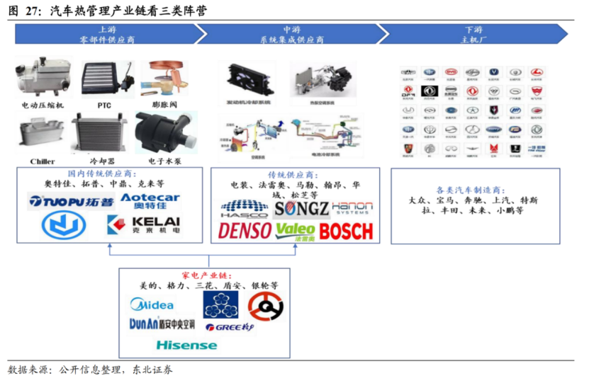东北证券陈玉卢等人在4月6日发布的研报中表示,我国汽车热管理产业链由上游零部件、中游系统集成供应商、下游主机厂组成。