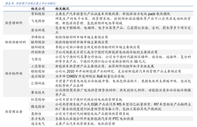 国盛证券丁逸朦等人在6月19日发布的研报中表示,热管理产业链中,热管理部件主要上市公司有常铝股份(002160)、飞龙股份(002536)、盾安环境(002011);铝热传输材料涉及的上市公司有华峰铝业、银邦股份(300337)、铭科精技;液冷板终端主要有科创能源、飞荣达(300602)、三花智控、银轮股份等;热管理业务涉及的公司主要有松芝股份(002454)、腾龙股份(603158)、奥特佳(002239)等。