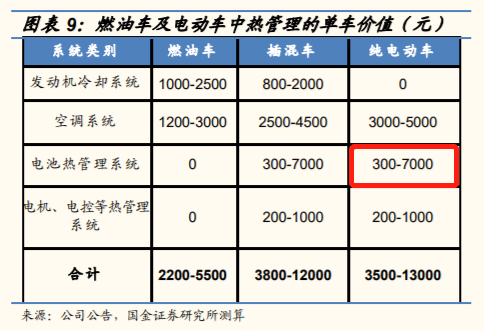 汽车热管理是汽车安全、高效和稳定运行的重要构成。国金证券(600109)在5月15日发布的研报中表示,从燃油车到电动车,热管理单车价值量大幅提升。燃油车中热管理系统单车价值约0.25-0.55万元,纯电动可达0.35-1.3万元,接近翻倍。