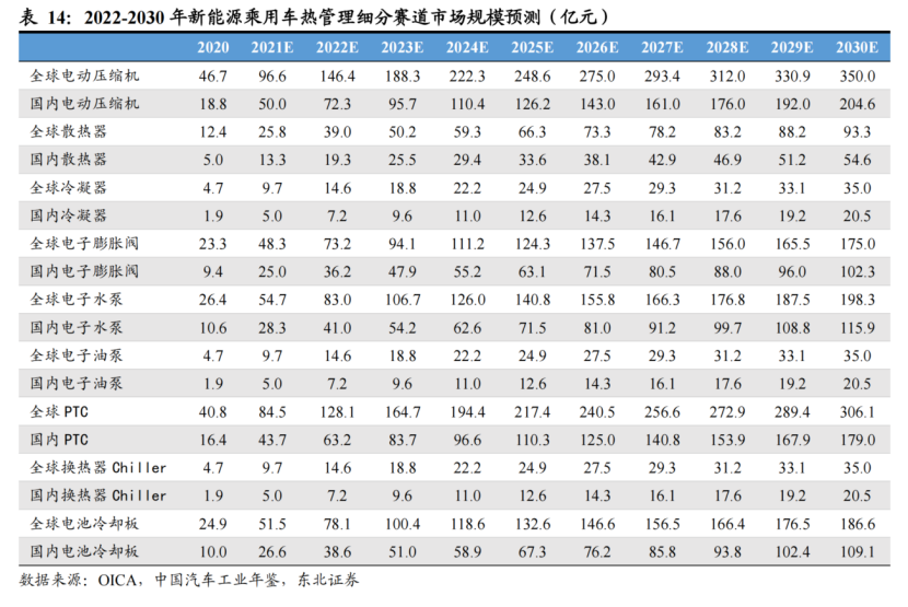 陈玉卢测算,预计2025年国内新能源车热管理核心细分赛道市场规模为500亿元。预计到 2030年,国内新能源车热管理市场规模达到1114亿元,占全球的58.5%。此外,预计2030年国内电动压缩机市场规模超过200亿元,电子膨胀阀市场规模超100亿元。